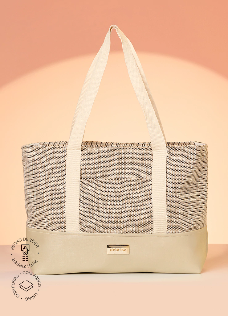 A bolsa de praia é perfeita para quem busca praticidade, espaço e estilo nos dias de sol. Com design funcional, ela conta com forro em poliéster e é ideal para levar tudo o que você precisa para a praia ou piscina. Possui bolso externo localizado entre as alças e bolso interno, garantindo organização prática dos seus itens pessoais. O fechamento superior com zíper mantém seus pertences seguros durante o uso. A alça é feita em fita resistente na cor cru, combinando com os tons naturais dos materiais e trazendo um toque leve e moderno ao visual. O fundo da bolsa é reforçado com EVA branco, proporcionando mais firmeza e durabilidade. Confeccionada nos materiais Trama e Duna 0.9 malha, que combinam leveza e resistência.