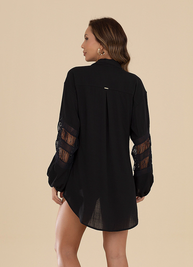 Essa peça possui uma modelagem mais ampla para prezar pela leveza e pelo conforto do verão. Seus botões são de metal inoxidável, personalizados Debrisa. As mangas possuem o caimento bufante invertido, com detalhe feito pelo mix de tecidos entre a base principal da peça (viscose) e a nossa famosa renda de poliamida, desenhada exclusivamente pelo nosso time.