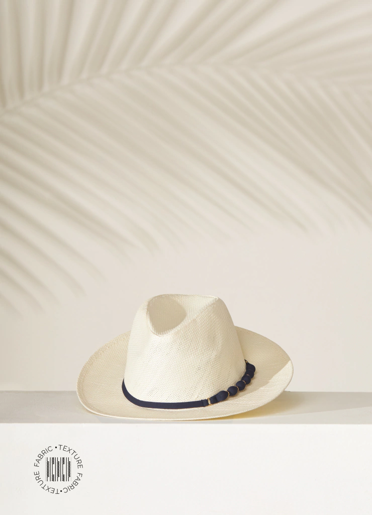 Chapéu modelo panamá com aba média e faixa em poliamida com detalhes em bubbles.