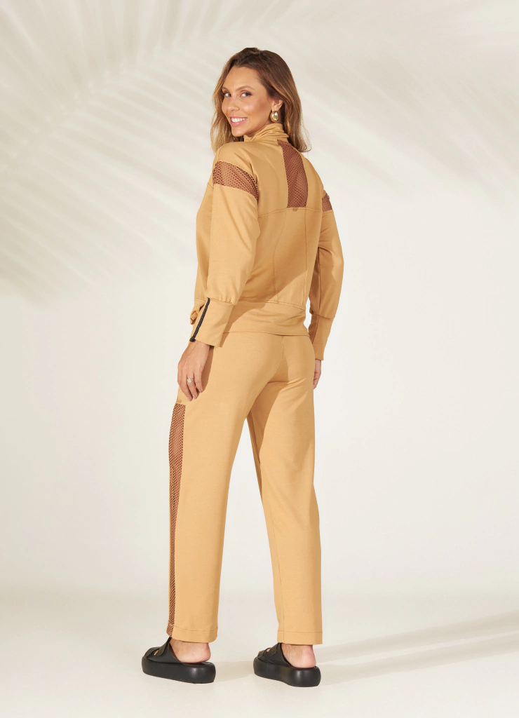 A gola com zíper permite um ajuste personalizado. A calça segue os detalhes da telinha nas laterais, possui cós elástico e cordão, oferecendo praticidade e estilo em um conjunto completo.