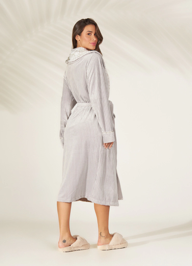 O roupão tornou-se uma peça indispensável para momentos de relaxamento e autocuidado. Com seu toque aveludado, proporciona uma sensação de conforto e suavidade ao vestir. Os tons claros complementam-se entre si, realçando a beleza da peça e adicionando um toque de elegância ao visual. Este item é essencial para criar uma atmosfera de tranquilidade em casa, permitindo que se desfrute de momentos de descanso com estilo e conforto incomparáveis.
