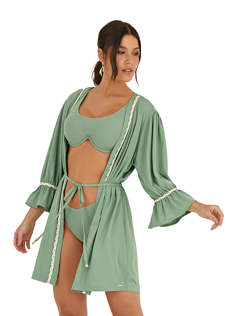 A cor Pistache acompanha a estampa Tropicalle como um clássico entre as cores Tropicana. Pistache é atemporal e versátil, sendo uma ótima opção para a cartela de cores das Mulheres Debrisa.