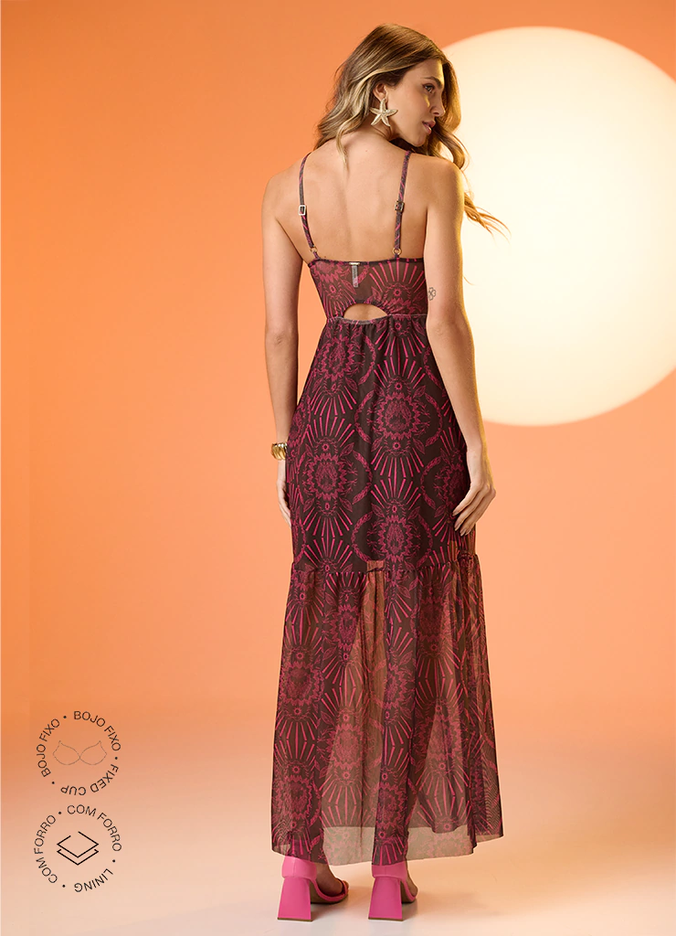 Confeccionado em Tule Flex, o vestido oferece elasticidade e caimento fluido. O forro interno em malha Vega até a altura da coxa oferece conforto e segurança.